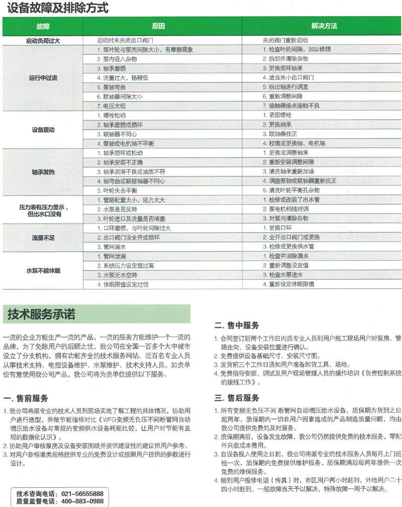 WFG系列无负压供水设备故障及排除方法